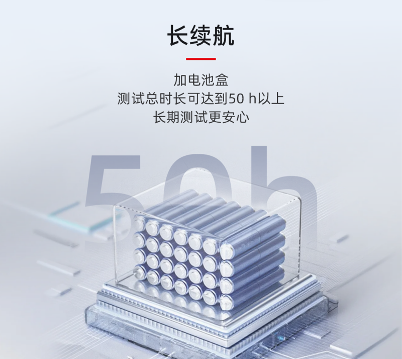 ◎ 配加电池盒,测试总时长可达到50h以上,长期测试更安心